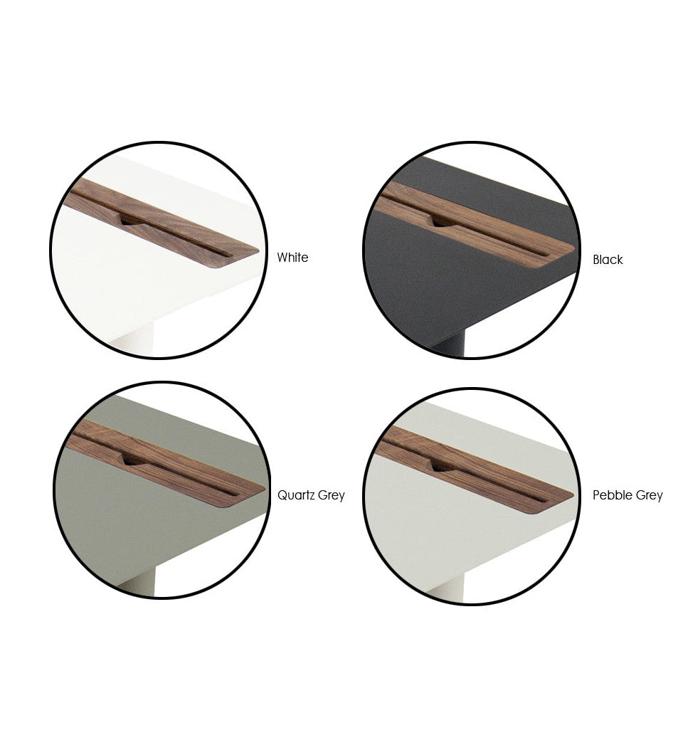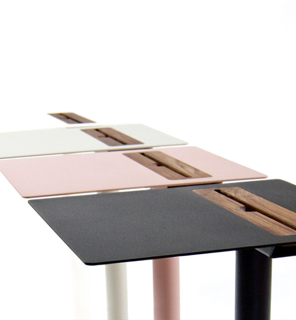 Frame in powder coated steel and tabletop insert in solid American walnut finished in translucent oil.